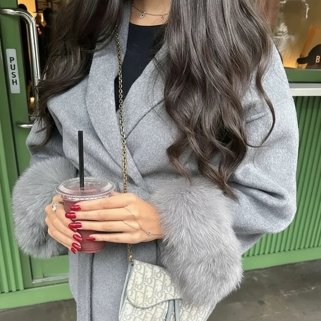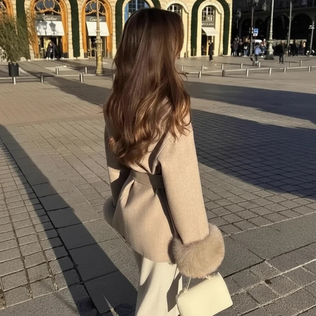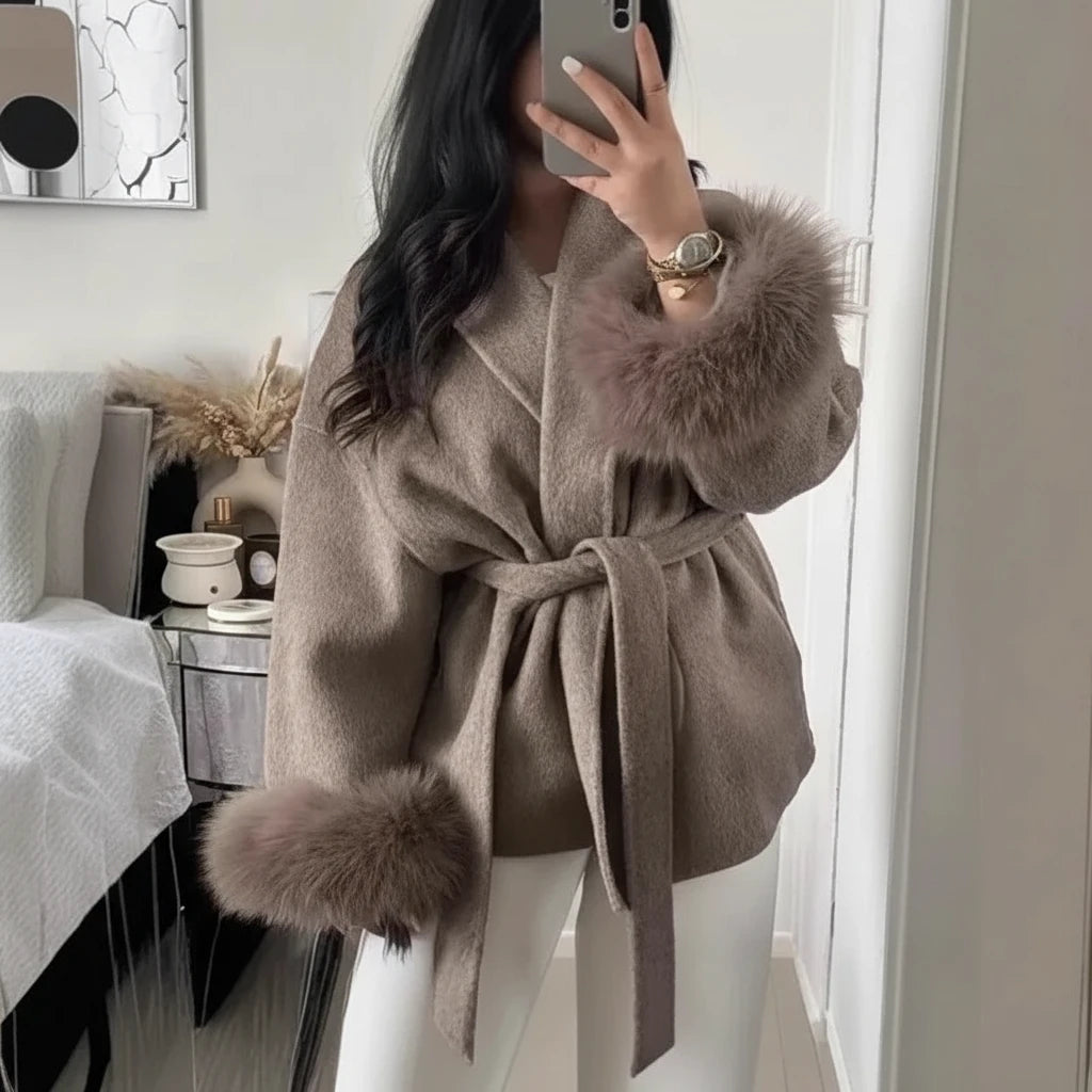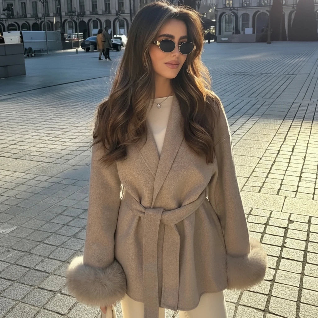 Pure Eleganz: Kurzer Wickelmantel mit luxuriösen Fell-Akzenten