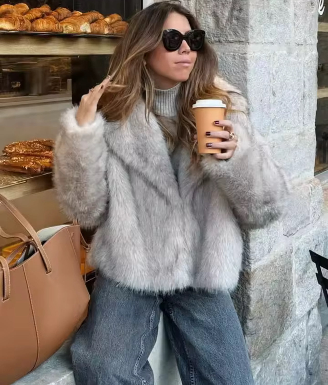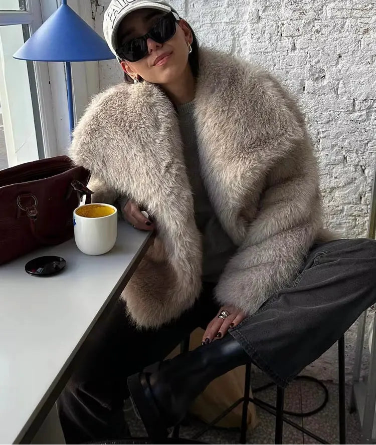 Dieses Outfit verkörpert lässige Eleganz für kalte Tage. Der luxuriöse Kunstpelz-Mantel in sanftem Grau sorgt für einen stilvollen Auftritt und hält gleichzeitig warm. Darunter rundet ein klassischer Rollkragenpullover in hellen Tönen den Look ab. Kombiniert mit weiten Jeans im Vintage-Stil entsteht ein moderner, urbaner Streetstyle. Accessoires wie eine große Leder-Shopper-Tasche in Beige und oversized Sonnenbrillen setzen zusätzliche Akzente. Perfekt für einen entspannten Stadtbummel, einen Café-Besuch oder einen stilvollen Alltag im Winter.